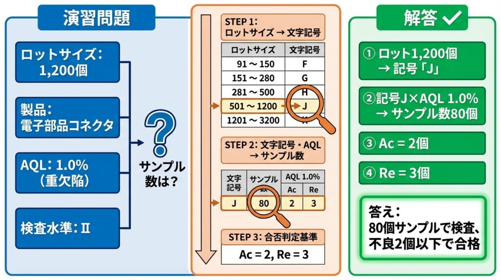 ① ロット1,200個 → 表1で「501~1200」× 水準Ⅱ = 記号「J」