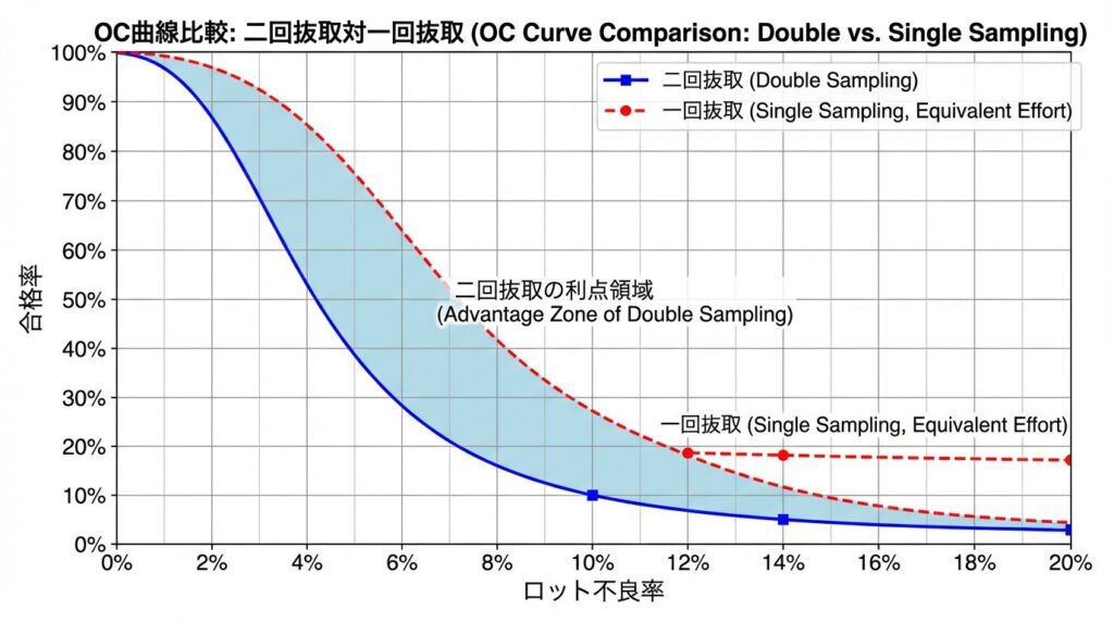 二回抜取検査の最大のメリットは、良品率が高いロットでは少ない検査個数で済み、不良率が高いロットでは厳格に判定できるという「柔軟性」にあります。