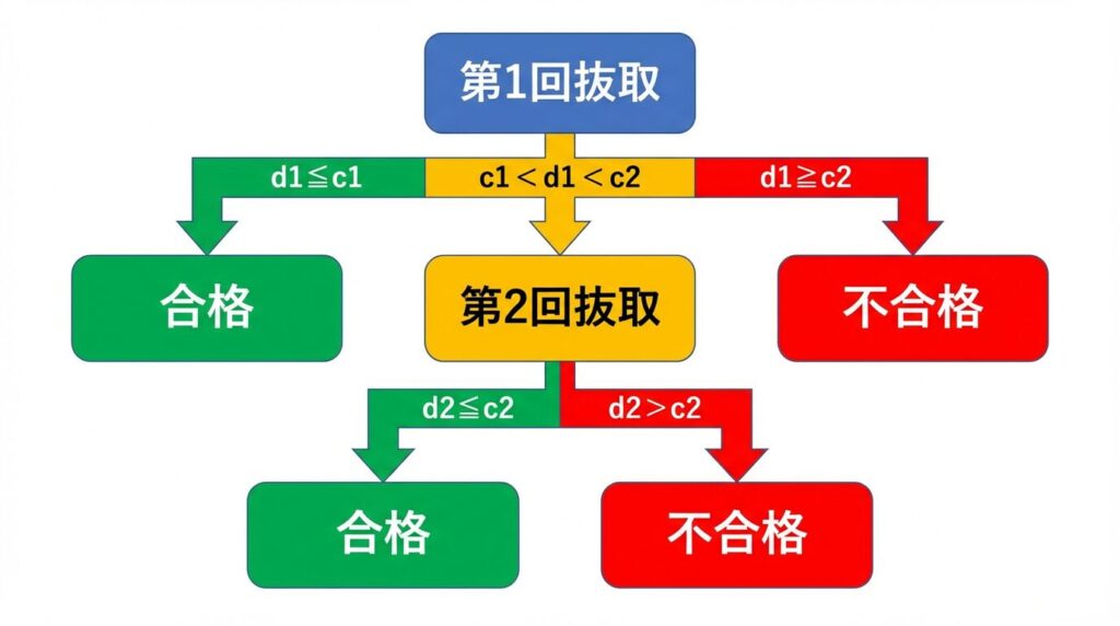 第1回抜取でd₁ ≤ c₁なら即合格d₁ ≥ c₂なら即不合格。それ以外の中間ゾーン(c₁ < d₁ < c₂)に入った場合だけ、第2回抜取へ進みます。