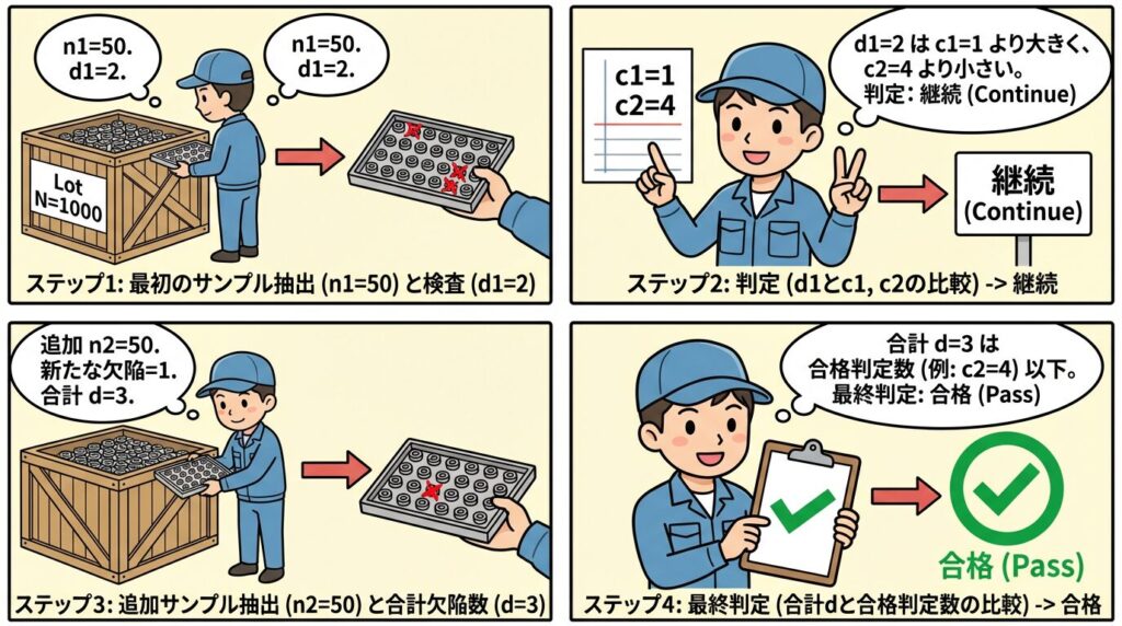 一回の抜取では判定がつかない「微妙なケース」に対して、もう一度サンプルを追加することで最終判断を行います。これにより、平均的な検査個数を減らしつつ、検査精度を維持できるという大きなメリットがあります。
