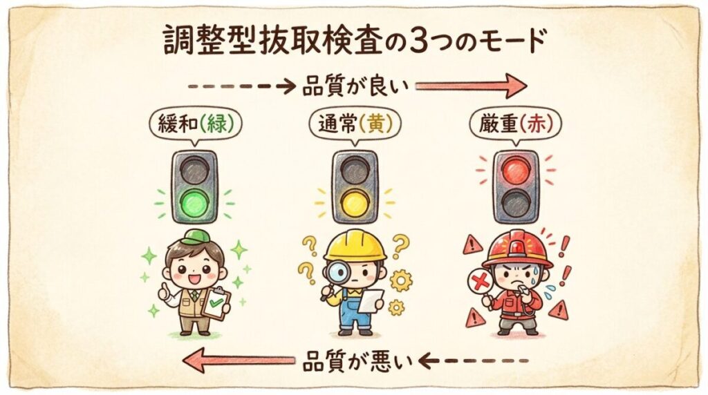 信号機は、交通状況に応じて「青→黄→赤」と変わりますよね?調整型抜取検査も同じで、品質の実績に応じて「緩和→通常→厳重」と検査モードが切り替わります。