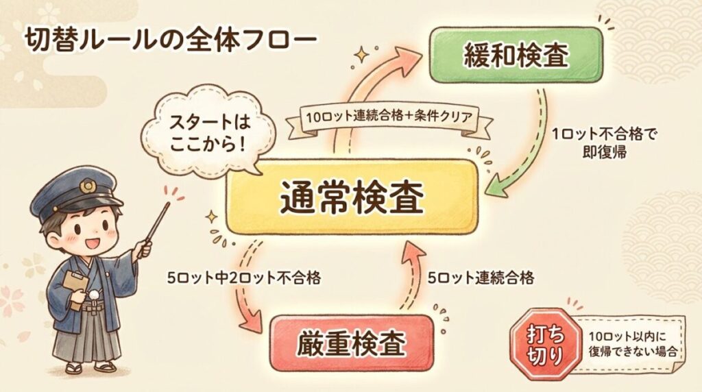 調整型抜取検査の切替ルールは、「5つの条件」を覚えれば完璧です。まずは全体像を把握しましょう。