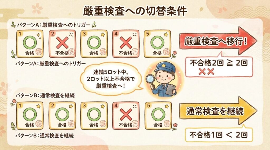 | 🟡→🔴 通常→厳重 | 連続5ロット中、2ロット以上が不合格 |