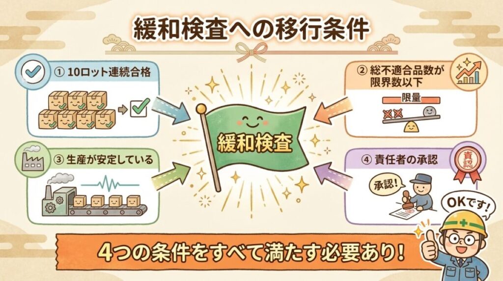 緩和検査への移行は、単に「10ロット連続で合格すればOK」ではありません。4つの条件をすべて満たす必要があります。
