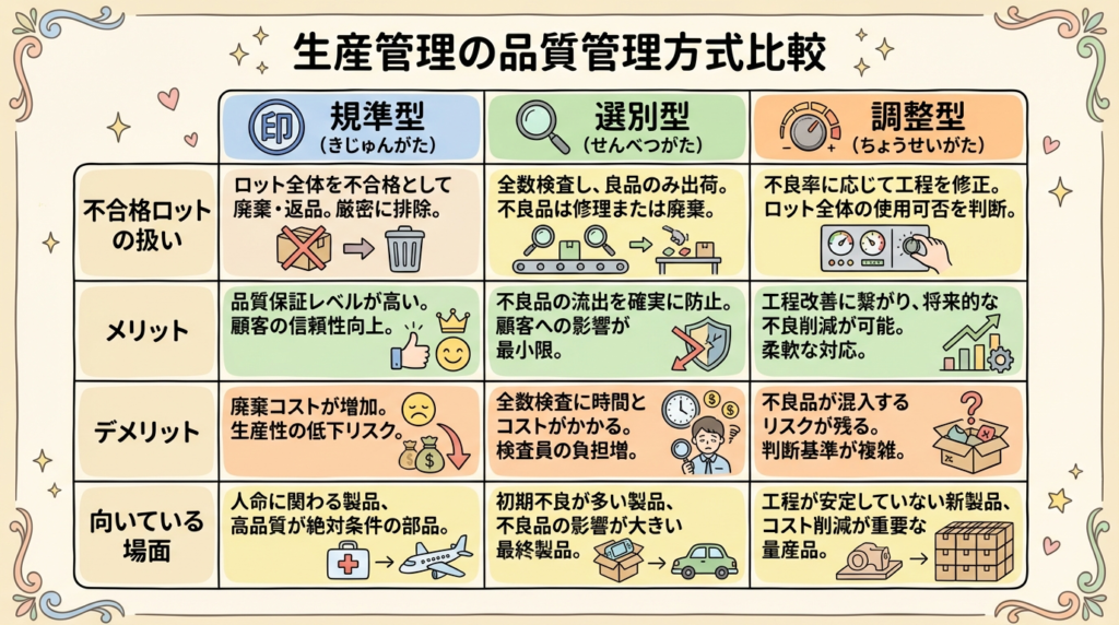 教科書で読むと言葉が硬くて何が違うのか分かりにくいですよね。でも安心してください。この3つの違いは、「不合格になったロットをどう扱うか」——たったこれだけの違いです。