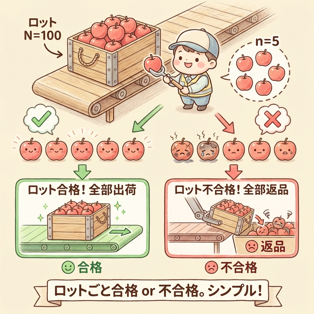 あなたはスーパーの仕入れ担当者です。農家からリンゴの箱(=ロット)が届きました。箱を開けて数個チェックしたら、腐ったリンゴが混じっていました。さあ、あなたならどうしますか?