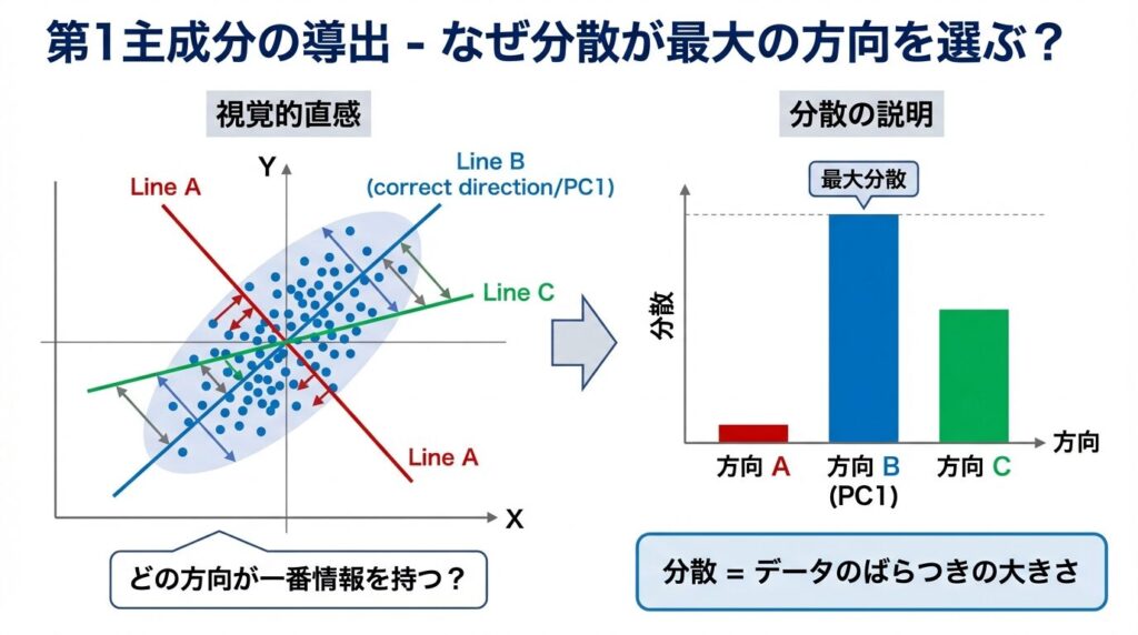 だから、「分散が最大になる方向」を第1主成分として選ぶんです! 🎯