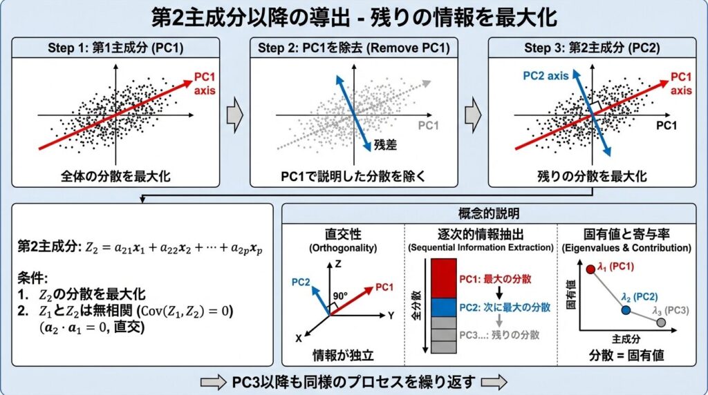 この条件を満たす方向を選ぶことで、第1主成分の次に重要な情報を抽出できます。