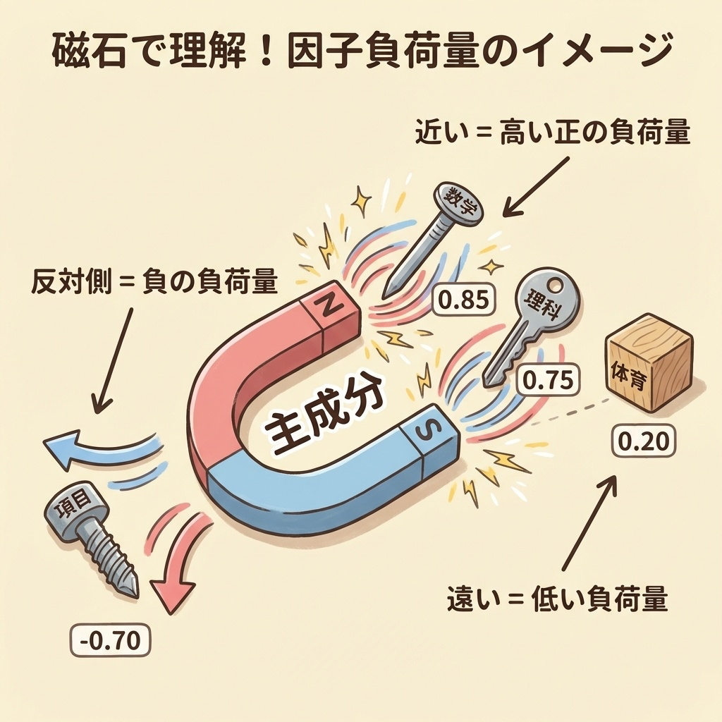 因子負荷量を理解する最強のたとえは「磁石」です。