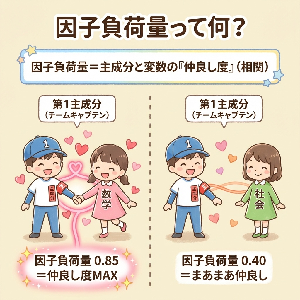 「第1主成分」と「数学」の因子負荷量が0.85なら、「数学ができる人は第1主成分も高い傾向がある」という強い関係を意味します。