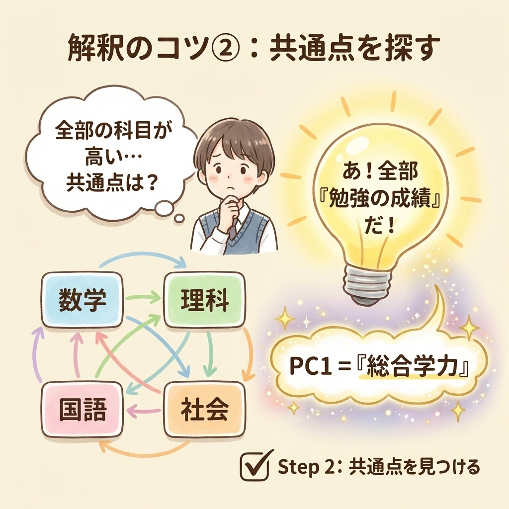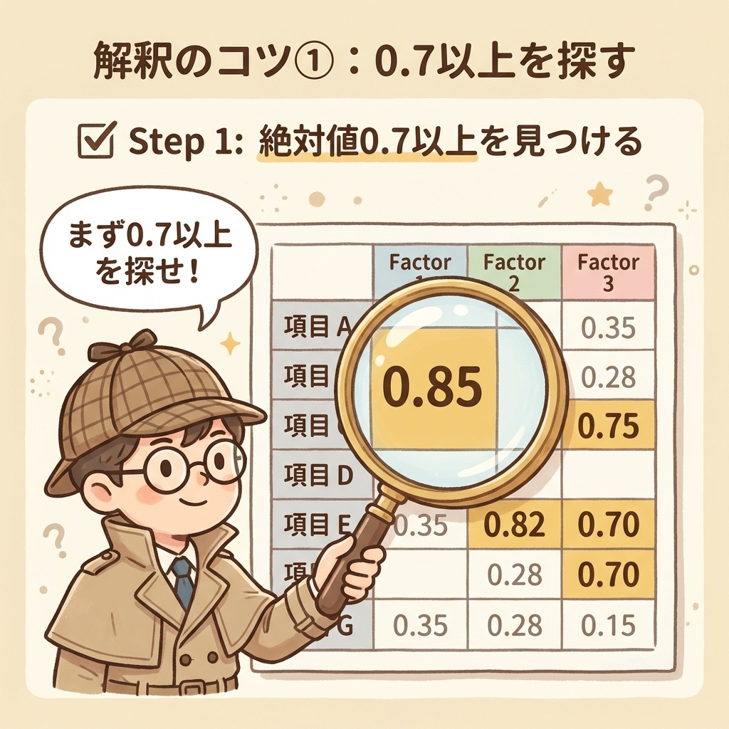 | 解釈の3ステップ | ①0.7以上を探す → ②共通点を見つける → ③名前をつける |