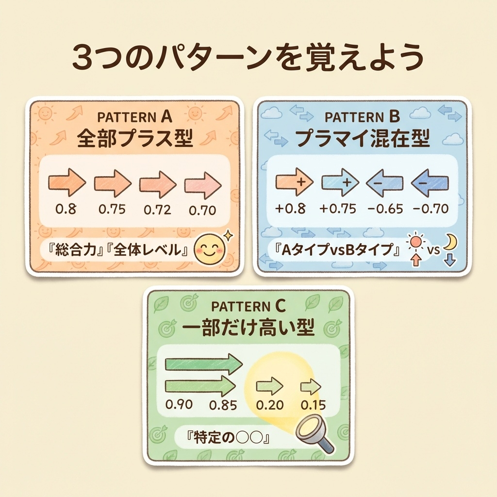 | ①全部プラス型 | すべての変数がプラスで高い | 全体のレベル | 「総合力」「全体サイズ」 |