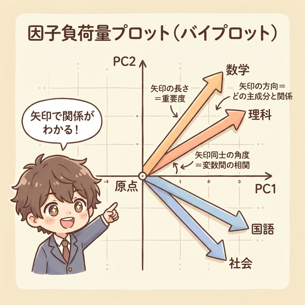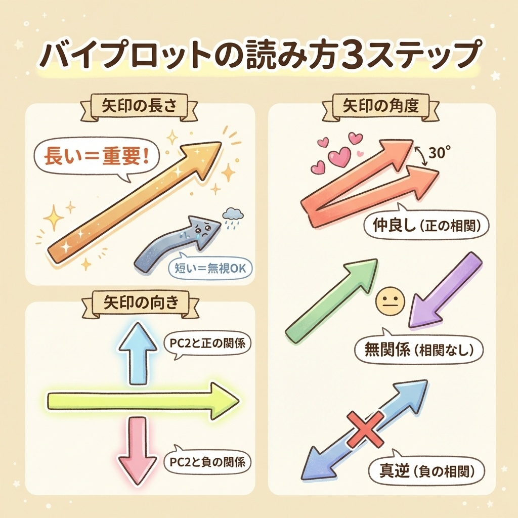 | ①矢印の長さ | 主成分にとっての重要度 | 長い矢印 = 重要な変数 |