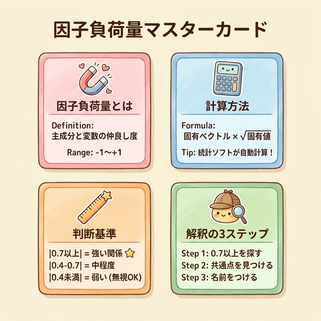 | 0.7以上 | 強い ⭐ | 主成分の意味を決める重要な変数 |