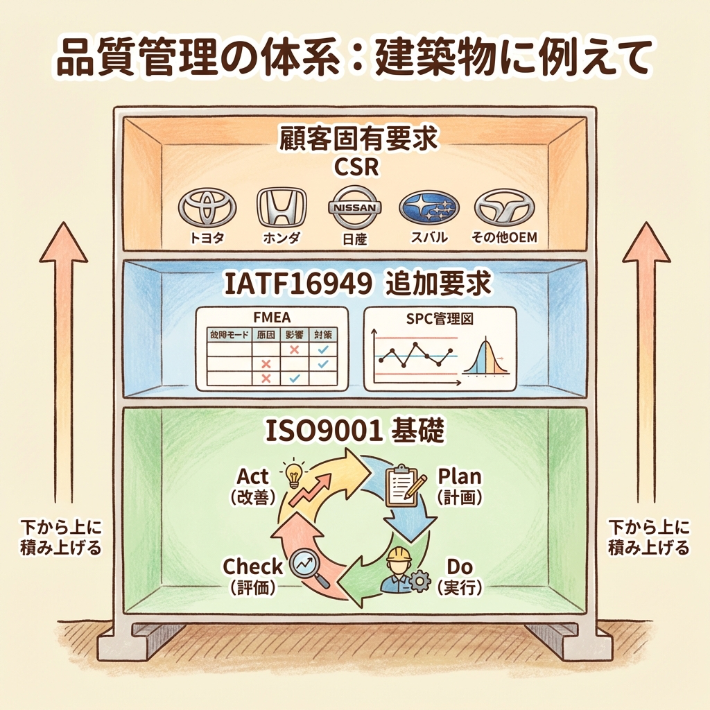 このイメージで覚えてください。ISO9001は「全業種で使える品質の基礎」であり、IATF16949はその上に「自動車産業だけに求められるルール」が追加された構造です。さらに3階部分には、取引先の自動車メーカーごとに異なる「顧客固有要求事項(CSR)」が乗っかります。