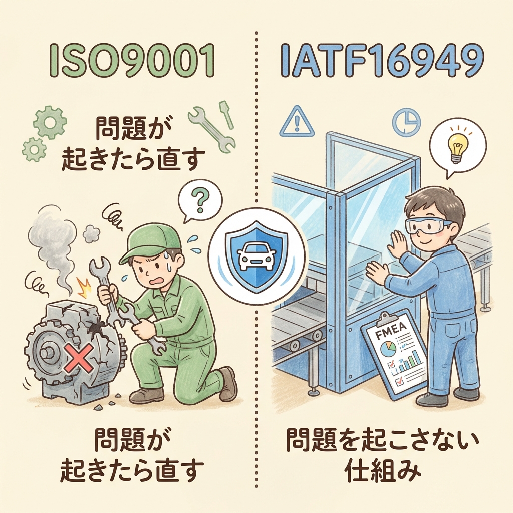 自動車は人の命に直結する製品です。「不良品が出てから対策する」では遅い。だからIATF16949は「不良を出さない仕組み」を設計段階から構築することを要求しています。この思想の違いが、両者を分ける最も本質的なポイントです。