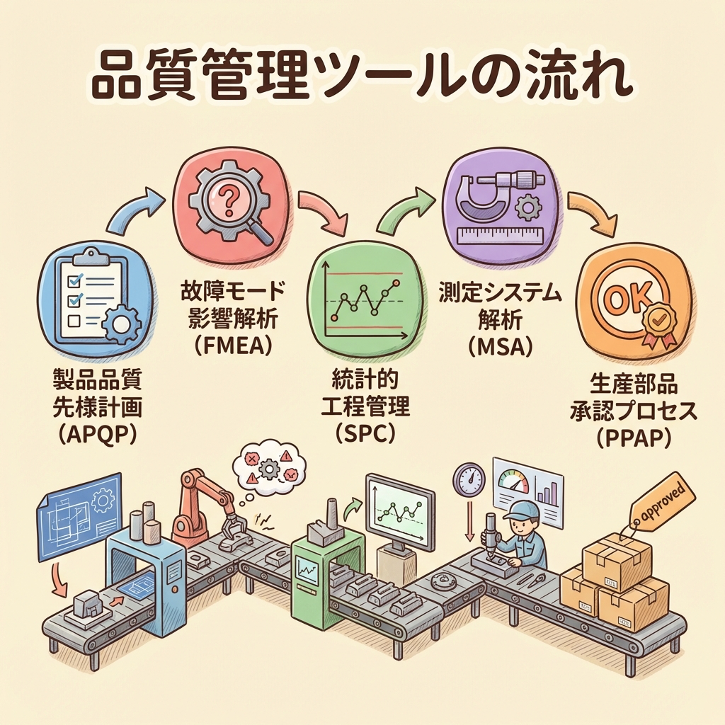 これらの5つのコアツールは単独で使うものではなく、APQPで計画 → FMEAでリスク分析 → SPCで工程監視 → MSAで測定信頼性を担保 → PPAPで顧客承認──という流れで連携しています。