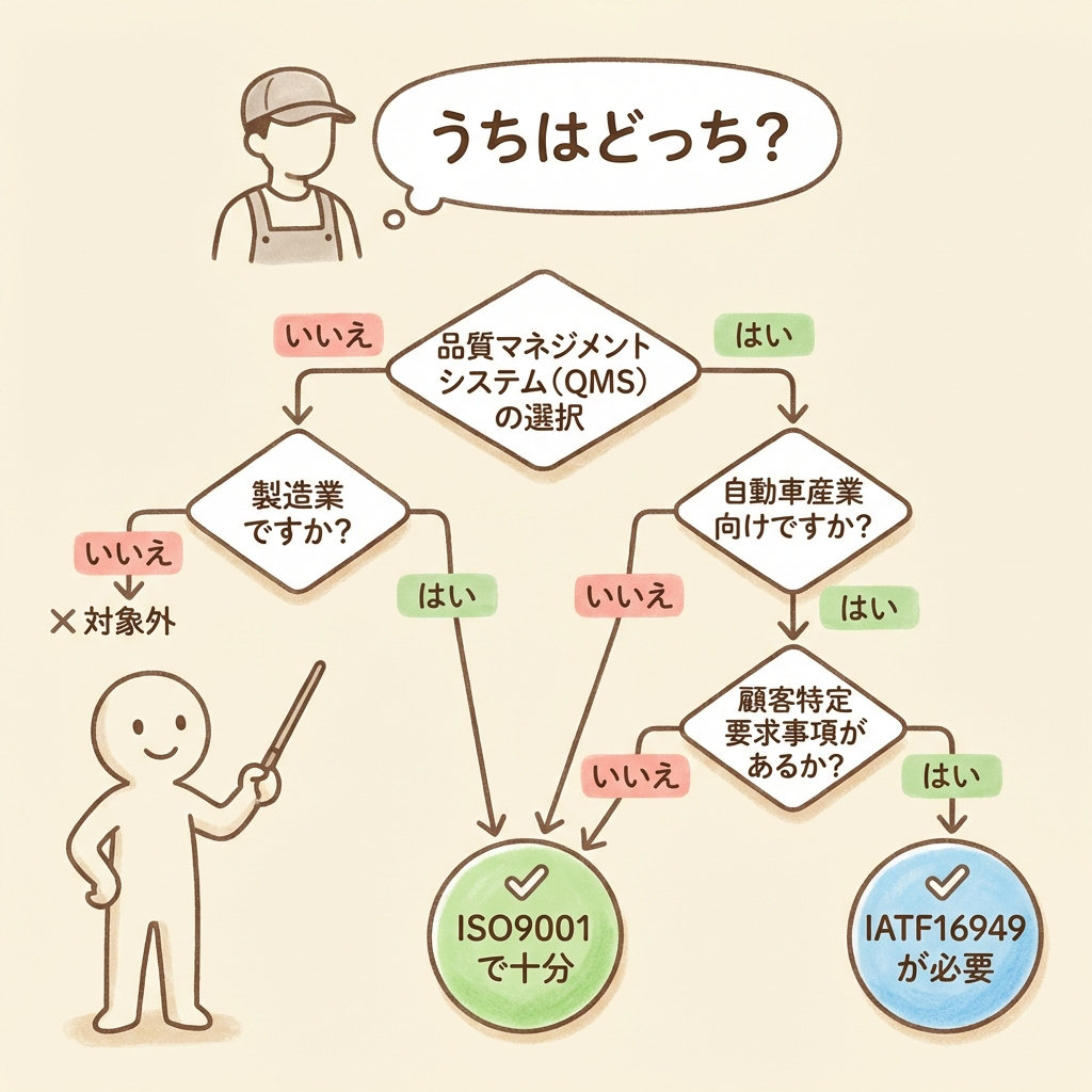 ここまでの知識を踏まえて、「自社に必要なのはISO9001だけで十分なのか、それともIATF16949が必要なのか」を判定するフローチャートを用意しました。上から順に質問に答えるだけで、あなたの会社に必要な規格がわかります。