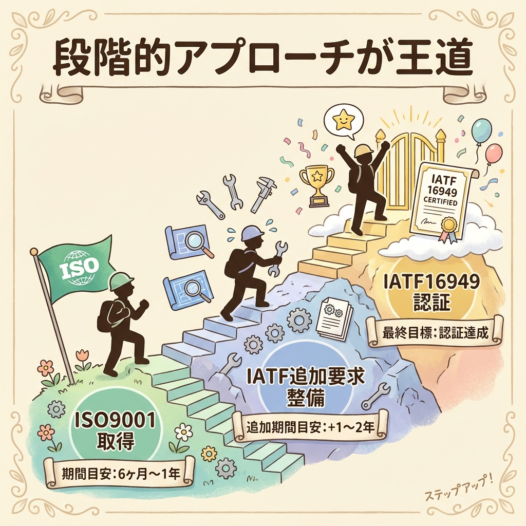 「いきなりIATF16949を取得する」ことも制度上は可能ですが、現実的にはISO9001を先に取得し、そのQMSを土台にしてIATF16949の追加要求に対応していく「段階的アプローチ」が最も効率的であり、審査機関からも推奨されています。