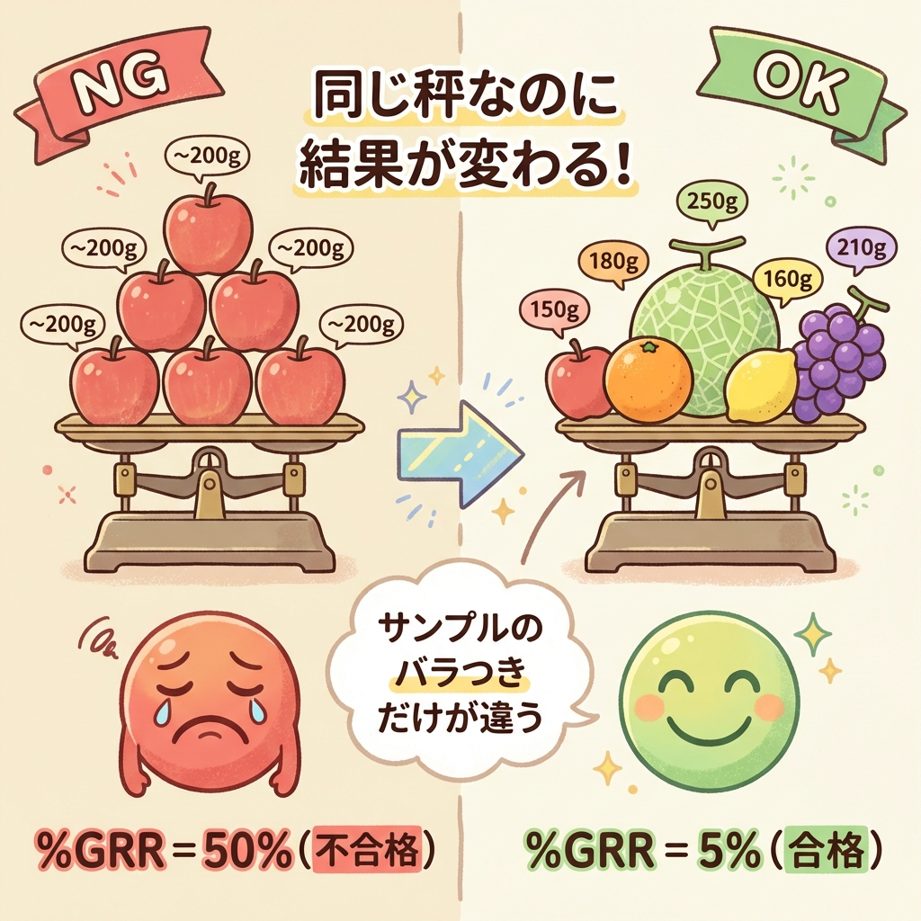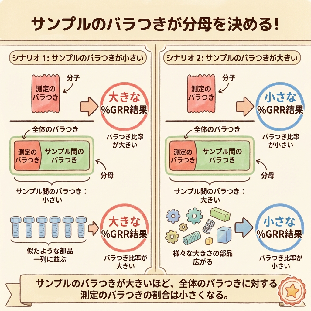 ① %GRR の分母には「サンプル間のバラつき」が含まれる → サンプルの選び方で結果が変わる