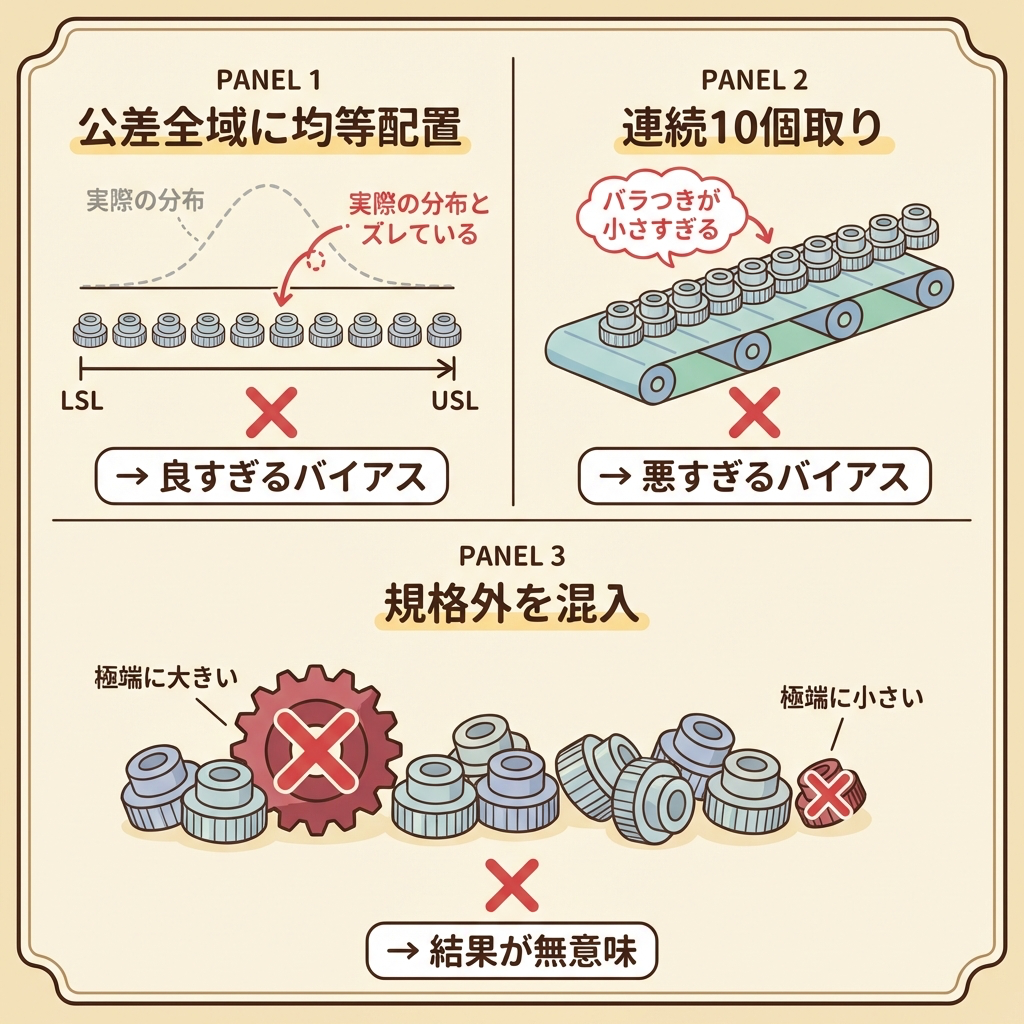 何が悪いのか:実際の工程では、サンプルの寸法は正規分布に近い形で散らばっています。公差の端にある部品は本来ごく少数なのに、このやり方では均等に割り当ててしまうため、サンプル間のバラつきが実際の工程よりもはるかに大きくなります。
