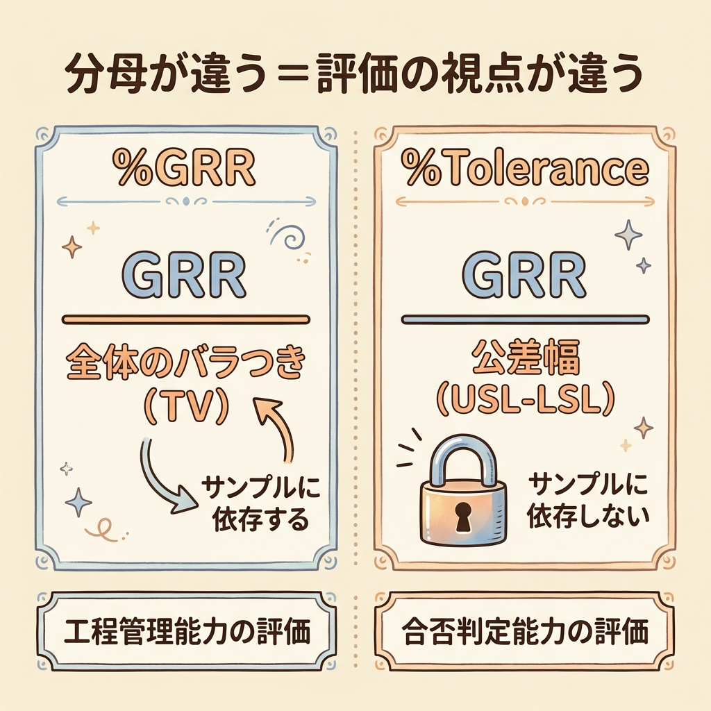 %GRR との違いは分母です。%GRR の分母が「全体のバラつき(=サンプル間のバラつきを含む)」だったのに対し、%Tolerance の分母は「公差幅(規格の上限−下限)」です。公差幅は図面で決まっている固定値なので、サンプルの選び方に一切影響されません。