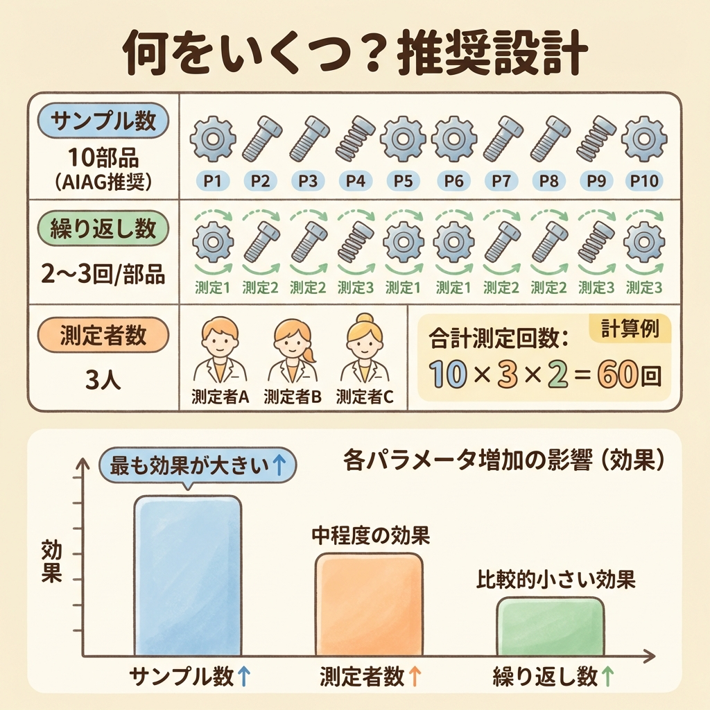 最も効果が大きいのはサンプル数の増加です。「%GRR が不安定」と感じるなら、まずサンプル数を10→15個に増やすことを検討してください。