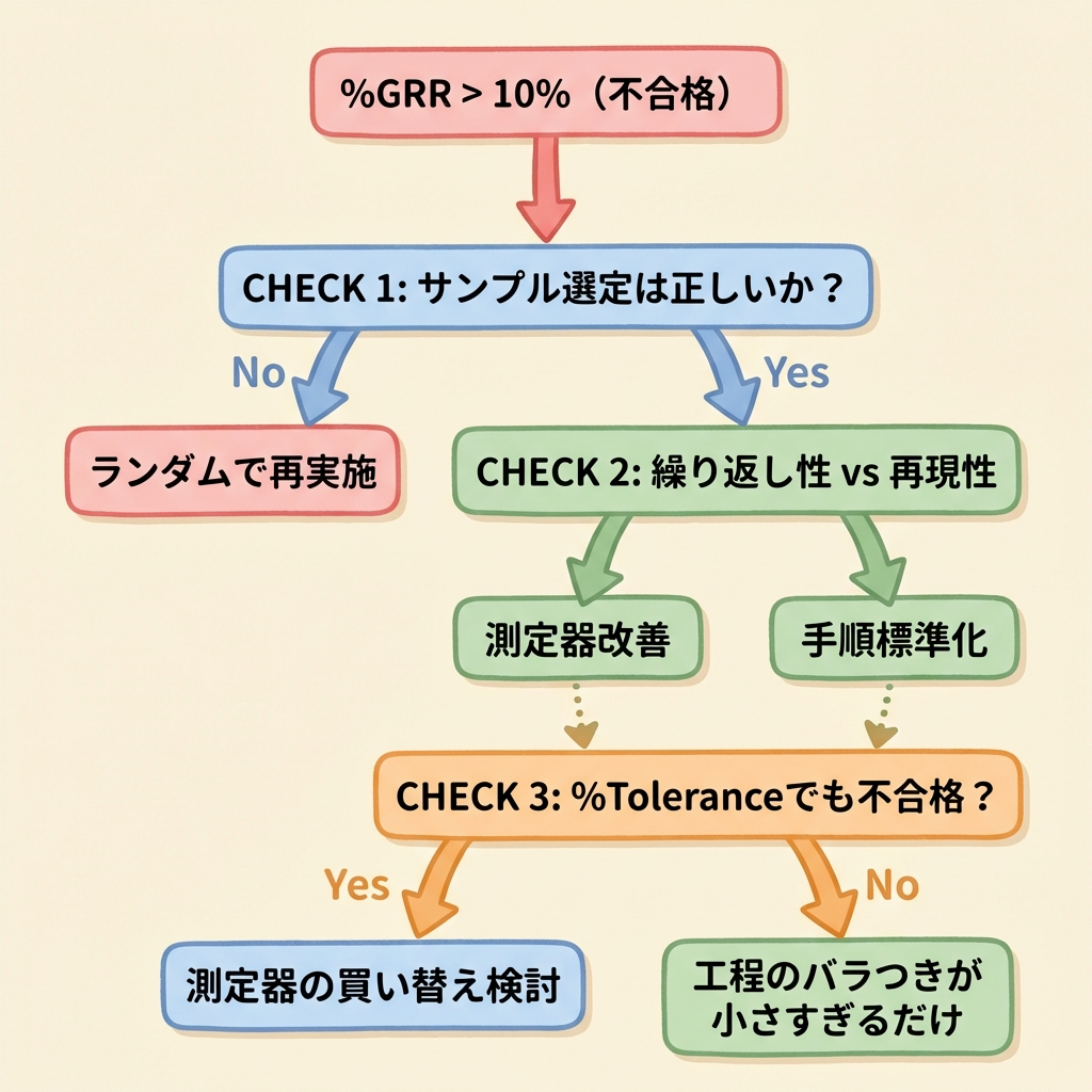 %GRR が基準を超えた場合、すぐに「測定器を買い替えよう」と結論を出すのは早計です。まずは以下のフローで原因を切り分けましょう。