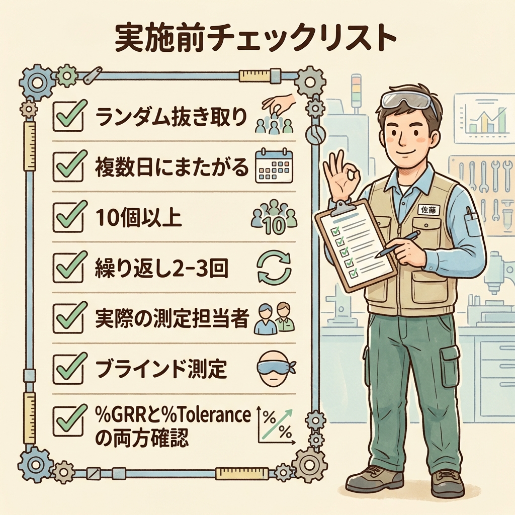 ゲージR&Rを実施する前に、以下のチェックリストを確認してください。サンプル選定ミスを防ぐだけで、やり直しの手間を大幅に減らせます。