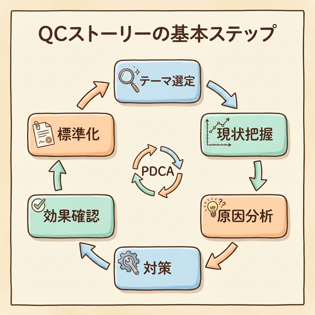 QCストーリーの各ステップを100点満点でやろうとすると、時間がいくらあっても足りません。特性要因図は5分で書く。パレート図はExcelで自動生成する。対策は「明日からできること」に絞る。——完璧なQCストーリーより、実際に変わった現場のほうが100倍価値があります。