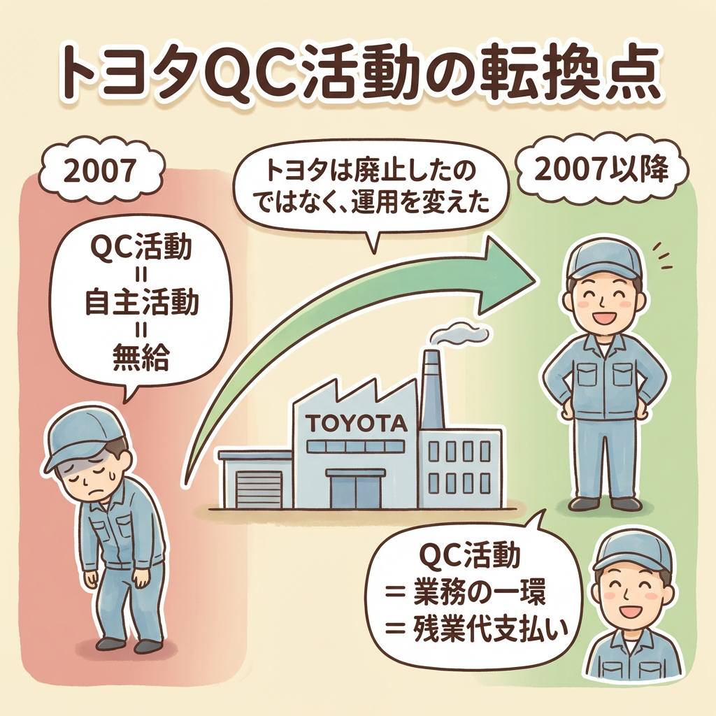 トヨタが行ったのは「廃止」ではなく「運用の見直し」です。具体的には、2007年にQCサークル活動を「自主的な活動」から「業務の一環」と位置づけ直し、活動時間に対して残業代を支払う方針に転換しました。これは当時、東洋経済をはじめ多くのメディアで報じられました。