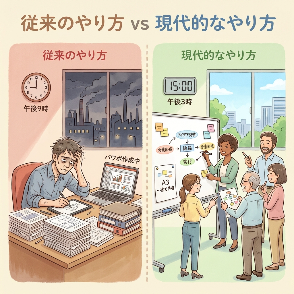 「時間が足りない」と現場から声が上がるでしょう。それでいいのです。時間が限られるからこそ、「本当に必要な活動」だけが残ります。発表用パワポの装飾に3時間かける余裕がなくなれば、活動は自然と「改善の中身」に集中するようになります。