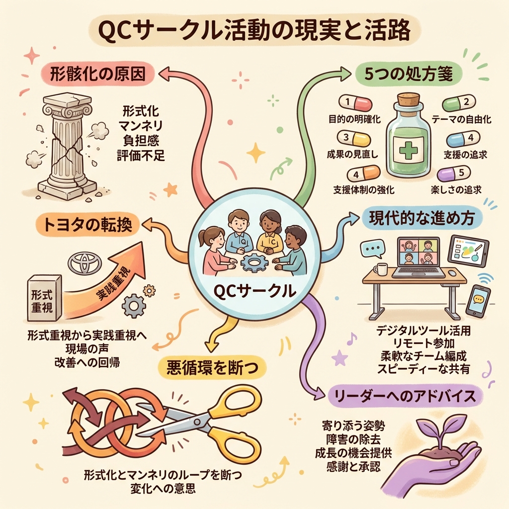 ここまで紹介した5つの処方箋は、すべて管理職・経営層が決断しないと実行できないことです。現場のQCサークルリーダーが一人で頑張っても、仕組みは変わりません。もしこの記事を読んでいるのが管理職の方なら、「現場のやる気の問題」ではなく「運営の仕組みの問題」として捉え直してください。