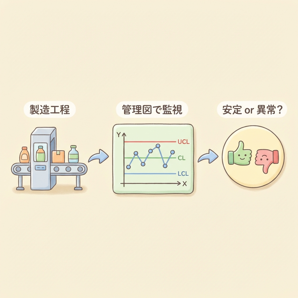 SPC(Statistical Process Control:統計的工程管理)とは、製造工程から得られるデータを統計的に監視し、品質不具合を「発生する前に」検知・予防する手法です。SPCの中核ツールが管理図(Control Chart)です。