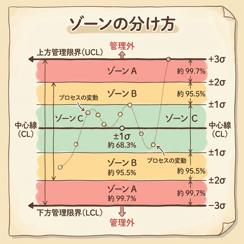 つまり管理図は「中心線の周りに±3σで線を引いた」だけではなく、その内側を1σ刻みで3つの帯(ゾーン)に分けてパターンを見る道具です。製造ラインで言えば、「ラインの中心にいるか」「壁際に寄っているか」「ラインを踏み越えたか」を常にチェックする仕組みです。