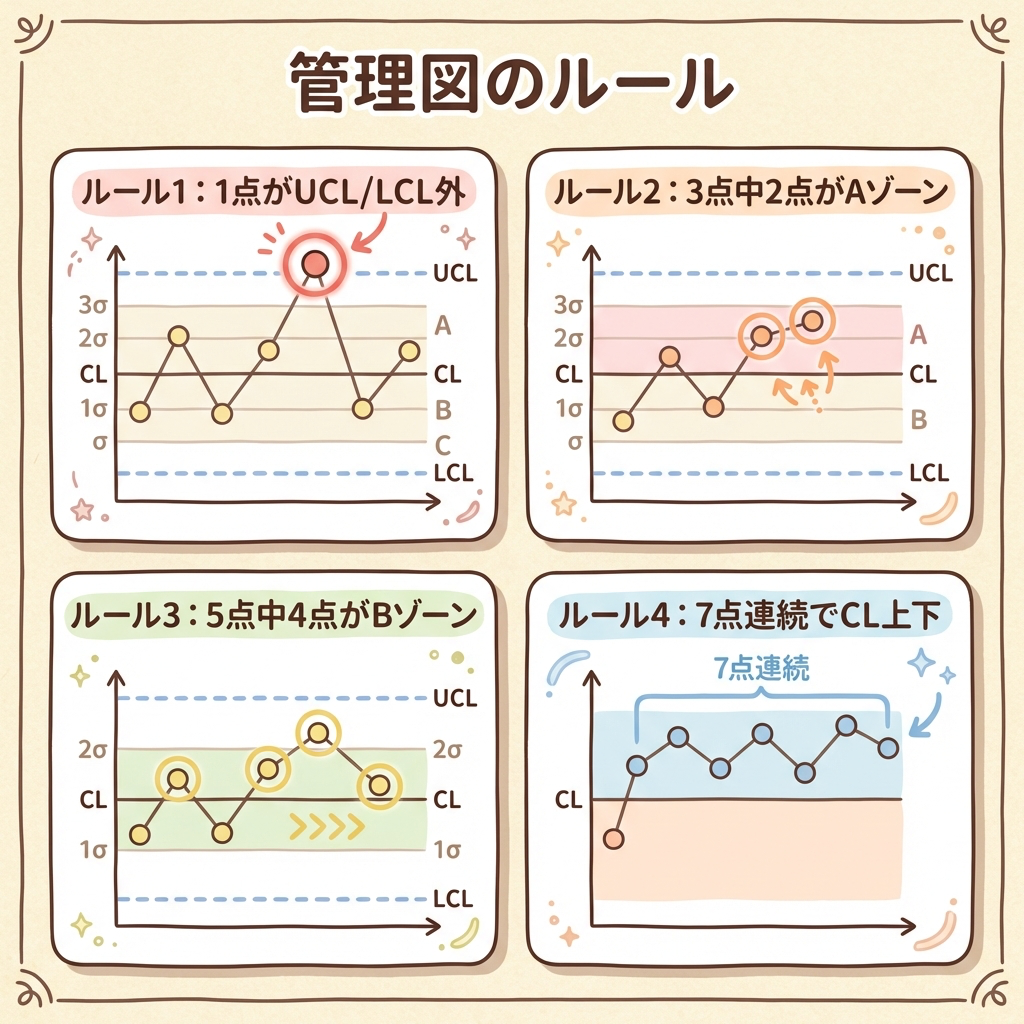 | 1 | 1点が3σ超え | 大シフト | 設備故障、段取りミス |