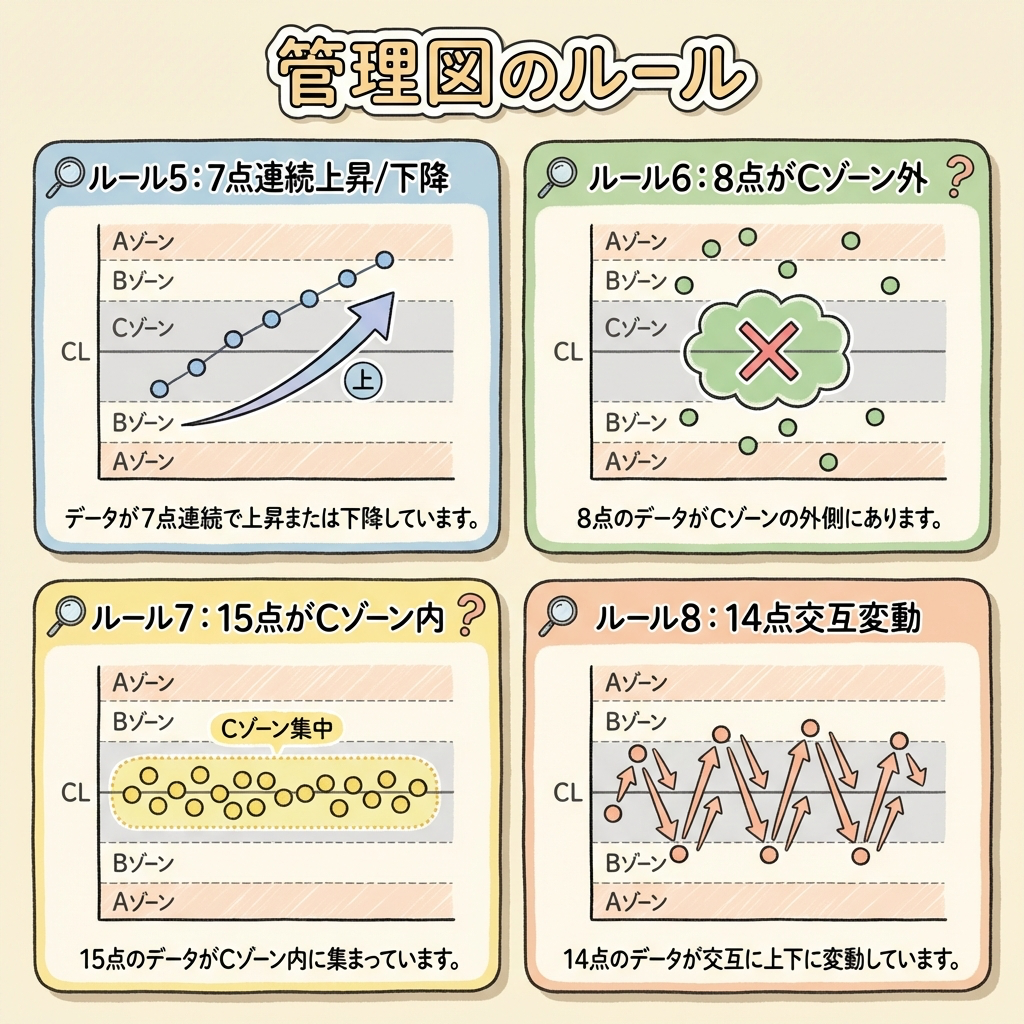 R管理図(範囲の管理図)にはルール1〜4のみを適用するのが一般的です。ルール5〜8はX̄管理図(平均値の管理図)向けのルールであり、R管理図ではパターンの意味が異なります。