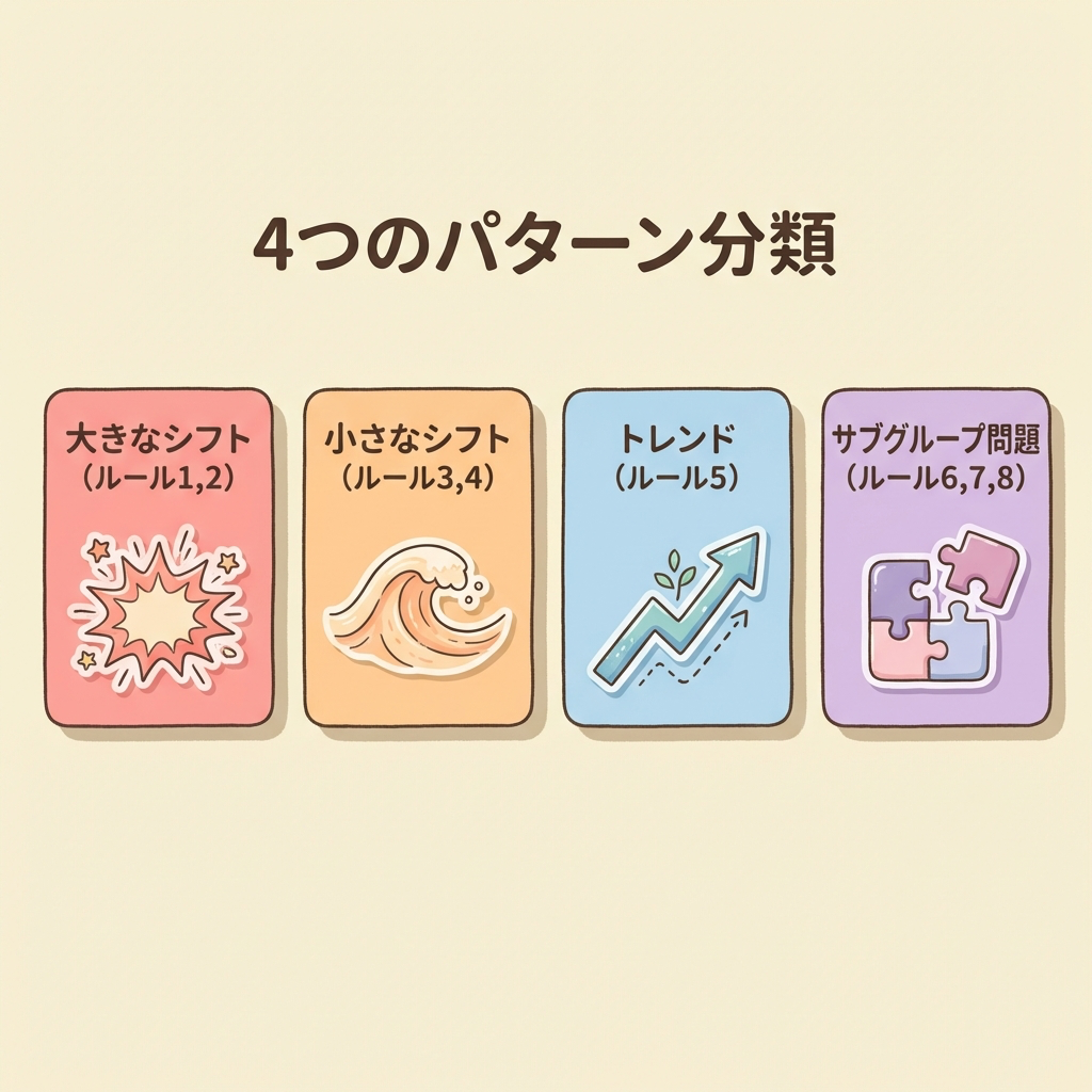 ルール1・2は「突発的な大きなシフト」を検出します。一方、ルール3・4は「じわじわと続く小さなシフト」を検出します。工具の摩耗や温度ドリフトのように、徐々に進行する異常はルール3・4でしか捕まえられません。