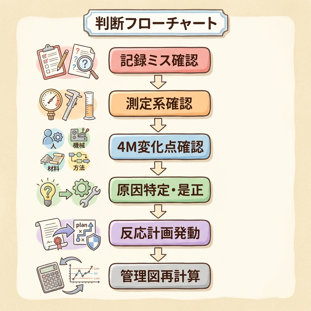 データの転記ミス、計算ミス、プロット位置の誤りがないか確認します。意外にも、管理図の「異常」の一定割合は単なる記録ミスです。