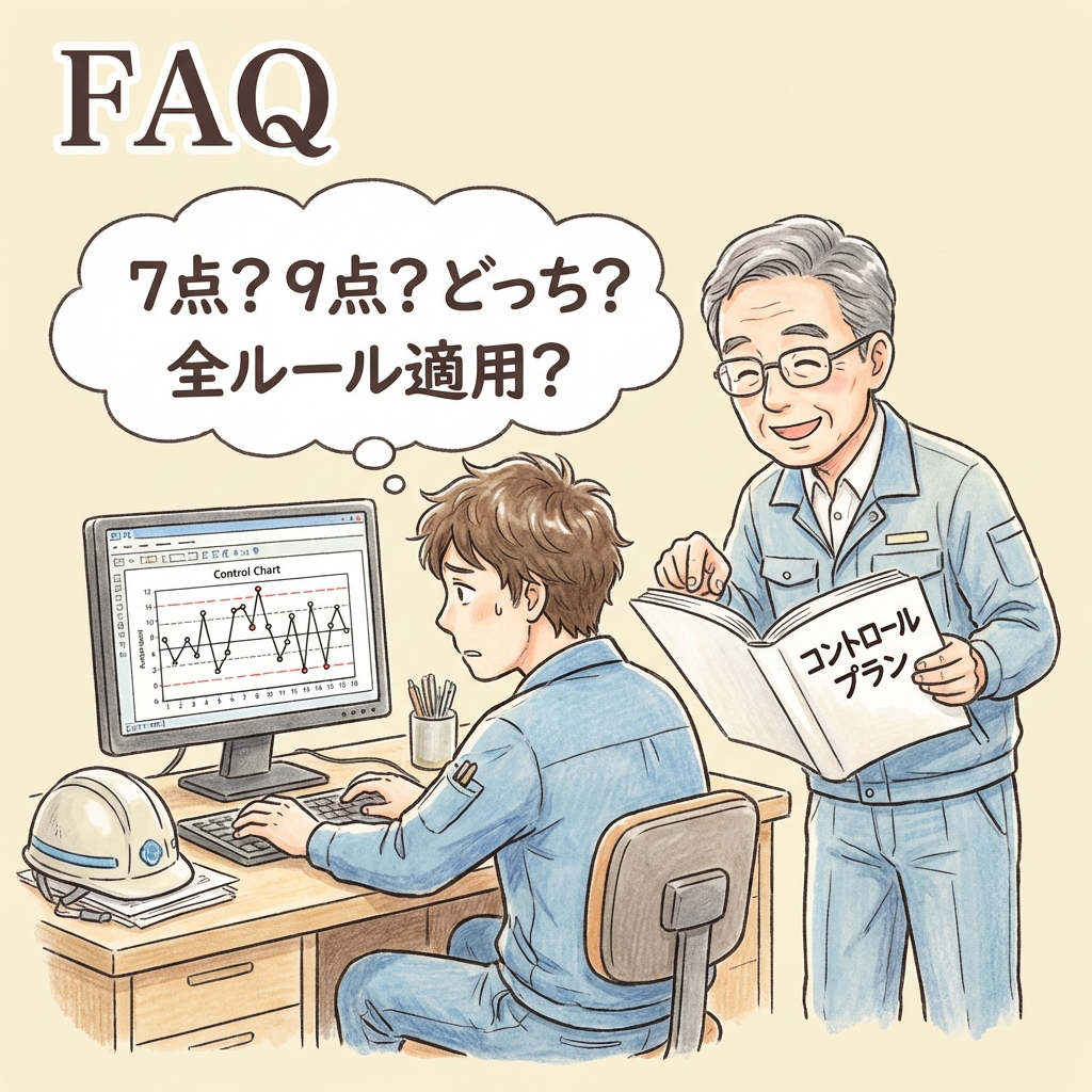 ルール4の「連」を「7点」とするソース(SPC参照マニュアル、Nelson原著)と「9点」とするソース(Wikipedia版Nelson Rules)があります。また、ルール5の「トレンド」を「6点」「7点」とするソースもあります。自社のコントロールプランや客先CSR(顧客固有要求事項)で指定された基準を必ず確認してください。本記事ではAIAG SPC参照マニュアルに準拠し、一般的な値を採用しています。