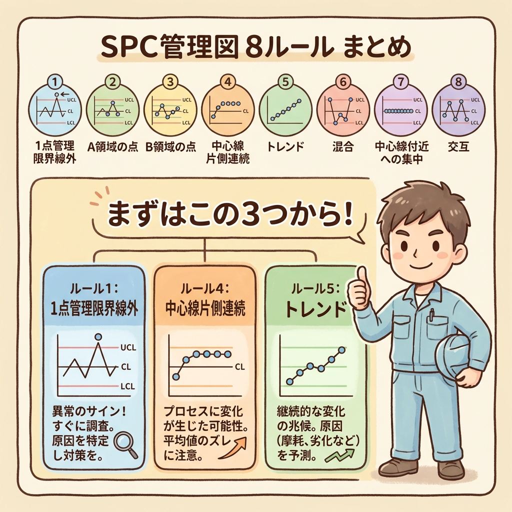まずはルール1(管理外れ)+ルール4(連)+ルール5(トレンド)の3つから始めてください。この3つだけで、管理図の検出力は劇的に向上します。