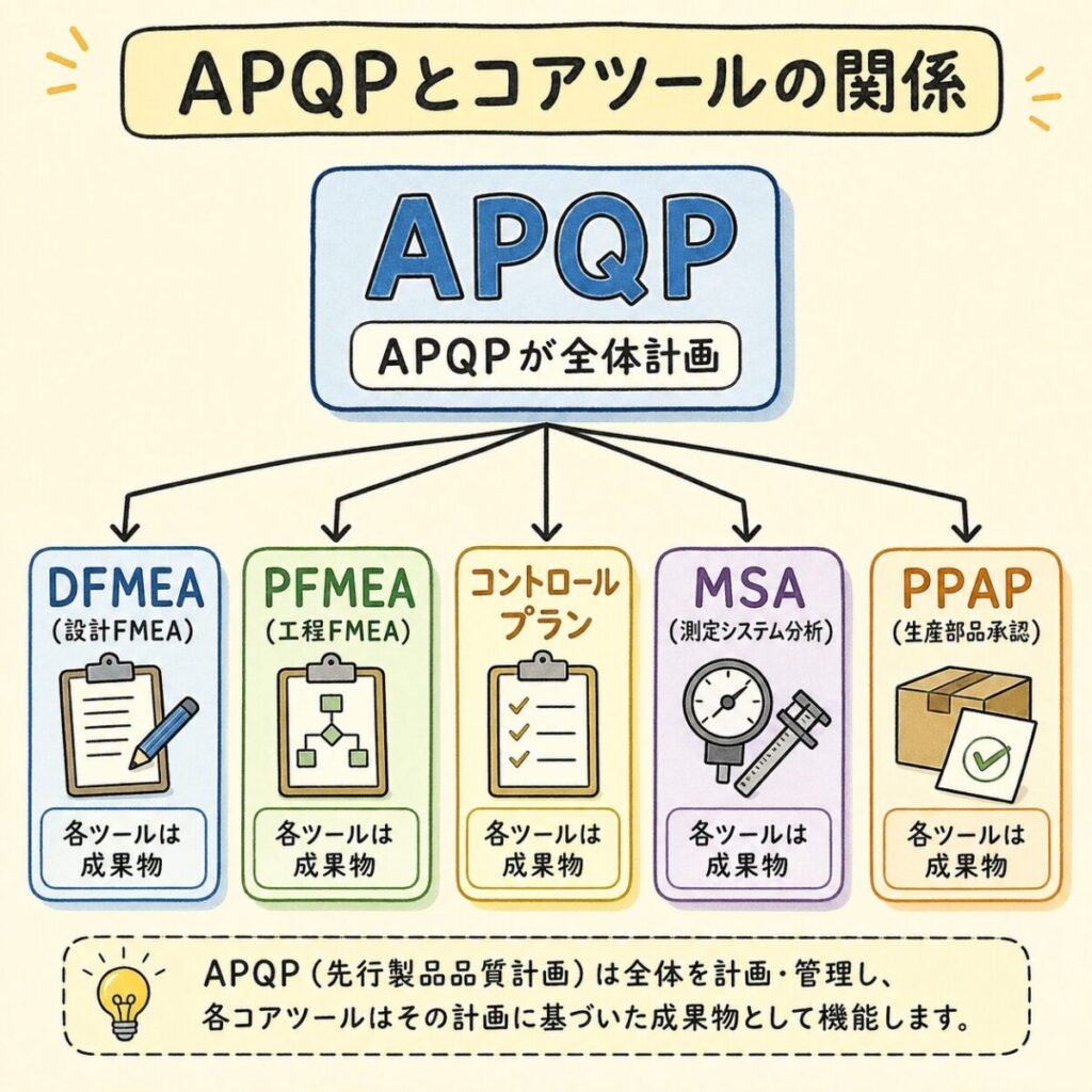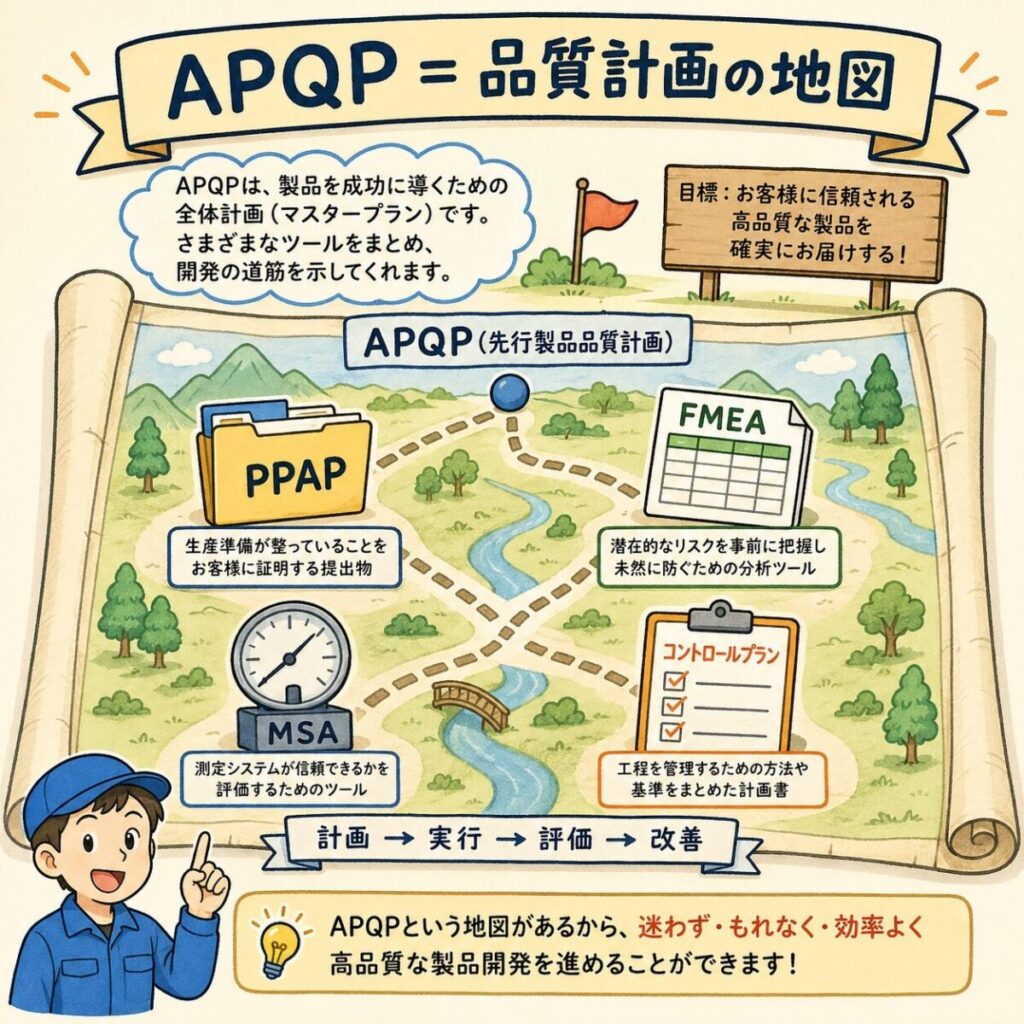 結論を先に言います。APQPとは、新製品を量産で失敗しないための「品質計画の地図」です。FMEAやMSAやPPAPは、その地図の中で使う道具です。この記事では、その全体像を「1枚の地図」でわかるように整理します。