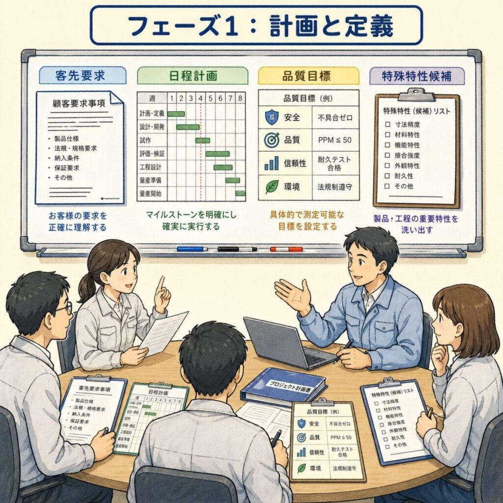 フェーズ1は、いきなりFMEAを書く段階ではありません。まずは客先要求、法規、品質目標、立上げ日程、重要特性を整理します。