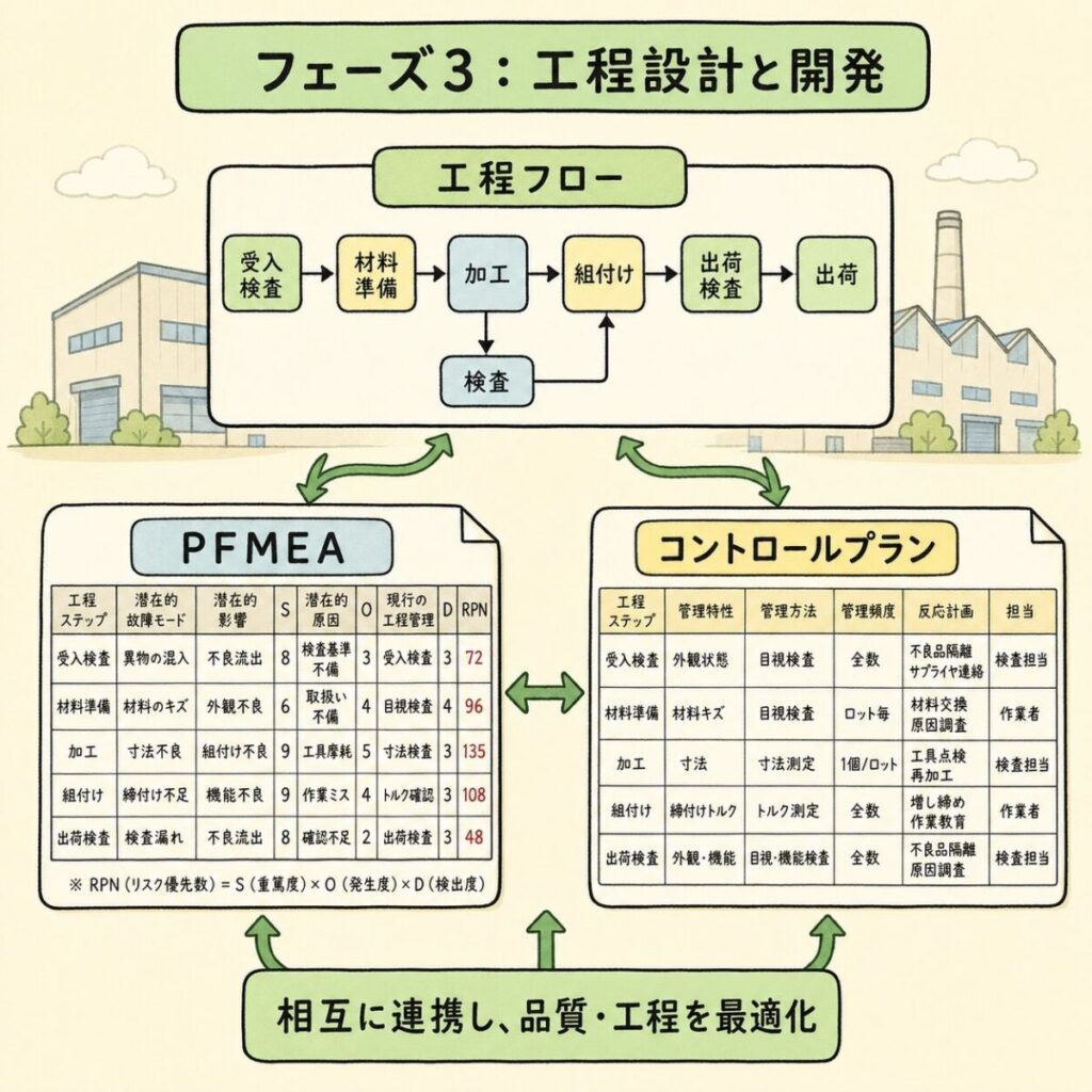実務では「FMEAは書いたが、現場管理に反映されていない」が一番多い失敗です。APQPでは、工程フロー → PFMEA → コントロールプランの整合が命です。