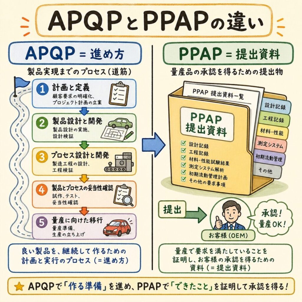 つまりPPAPはAPQPの最終アウトプットのひとつです。APQPという活動の結果として、客先へ「この部品は量産できます」と証拠を提出するのがPPAPだと考えるとわかりやすいです。