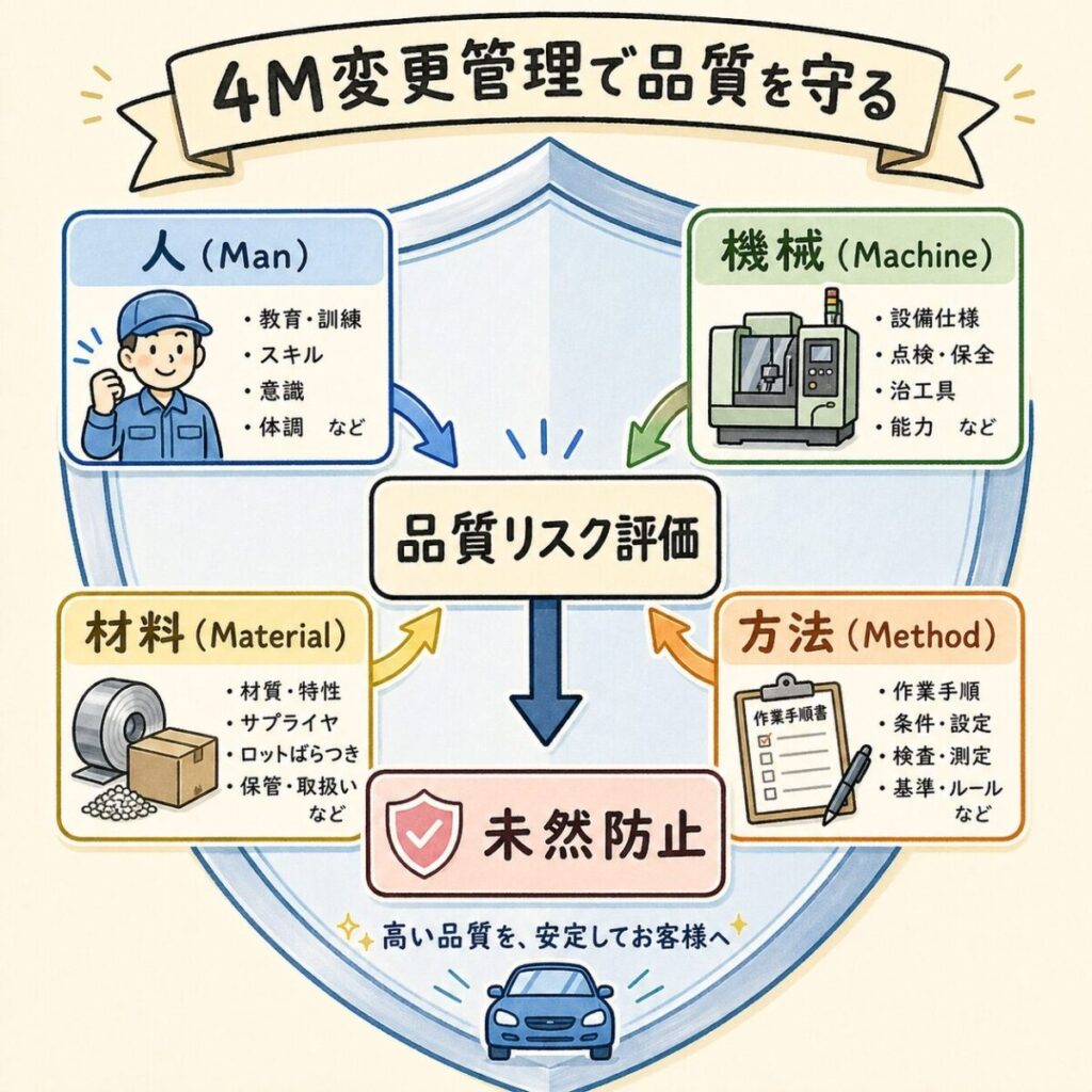 4M変更管理 = 人・機械・材料・方法の変化を見逃さず、品質影響を事前に評価し、必要な監視と対策を行う活動