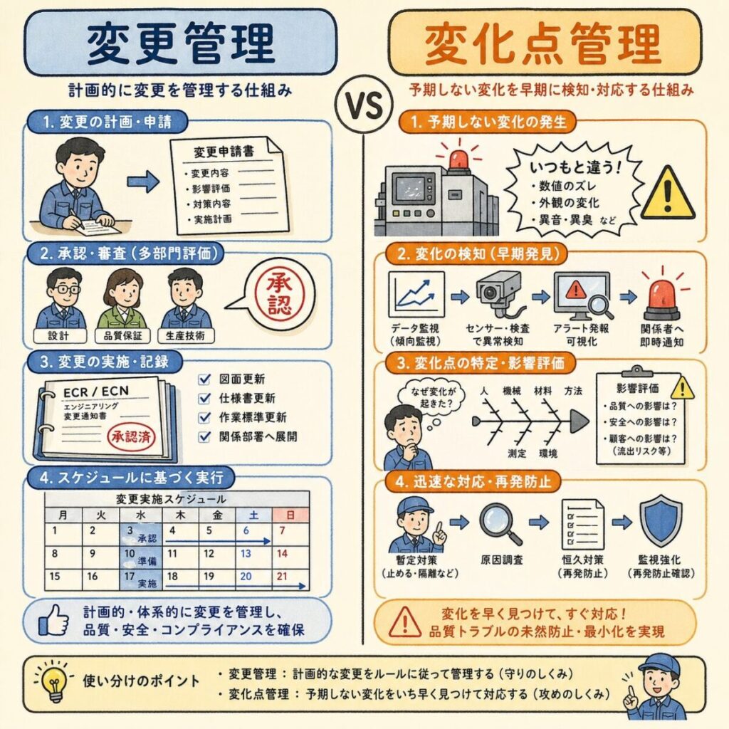 変更管理は、目的をもって変える活動です。たとえば「コストダウンのために副資材を変更する」「設備を更新する」などです。変化点管理は、意図したかどうかに関係なく、品質に影響しそうな変化を見逃さない活動です。
