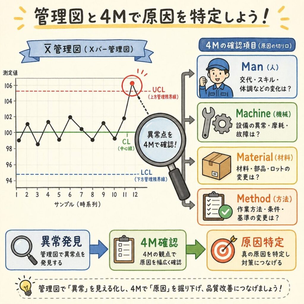 管理図は「異常が起きたこと」を教えてくれます。4M変更管理は「なぜ起きたかの候補」を教えてくれます。両方がそろって初めて現場で使えます。
