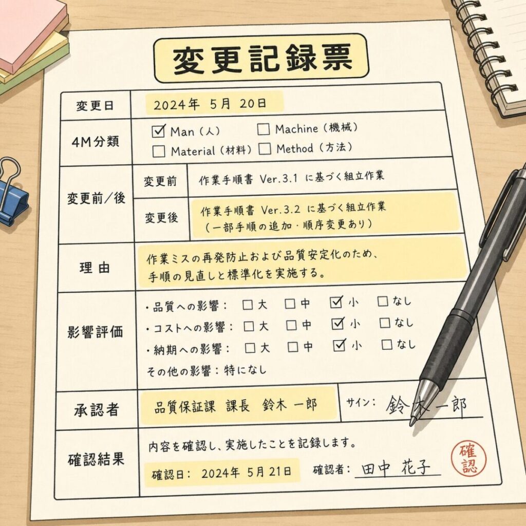 4M変更管理が形骸化する会社ほど、記録票が「変更内容」しか書けない作りになっています。