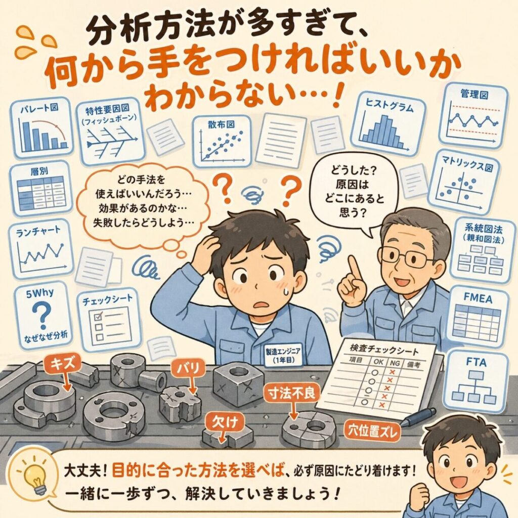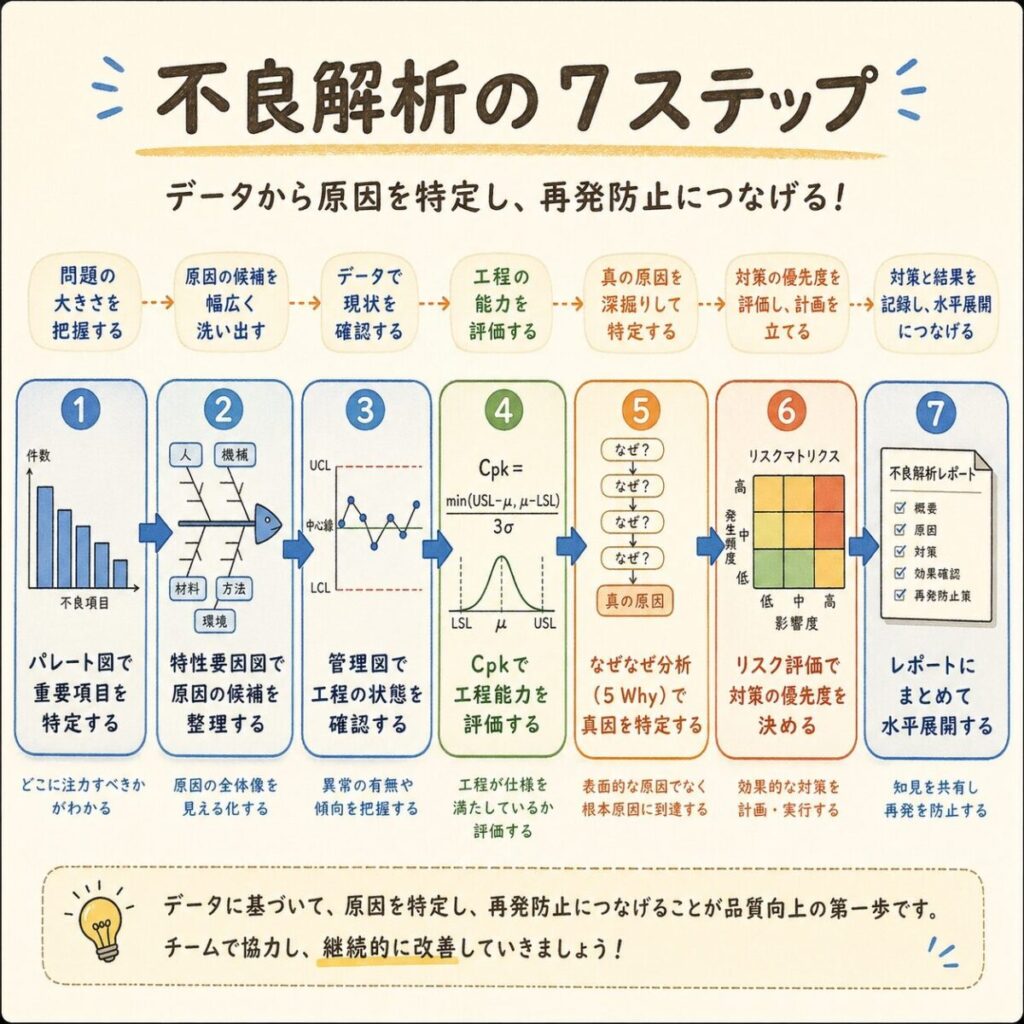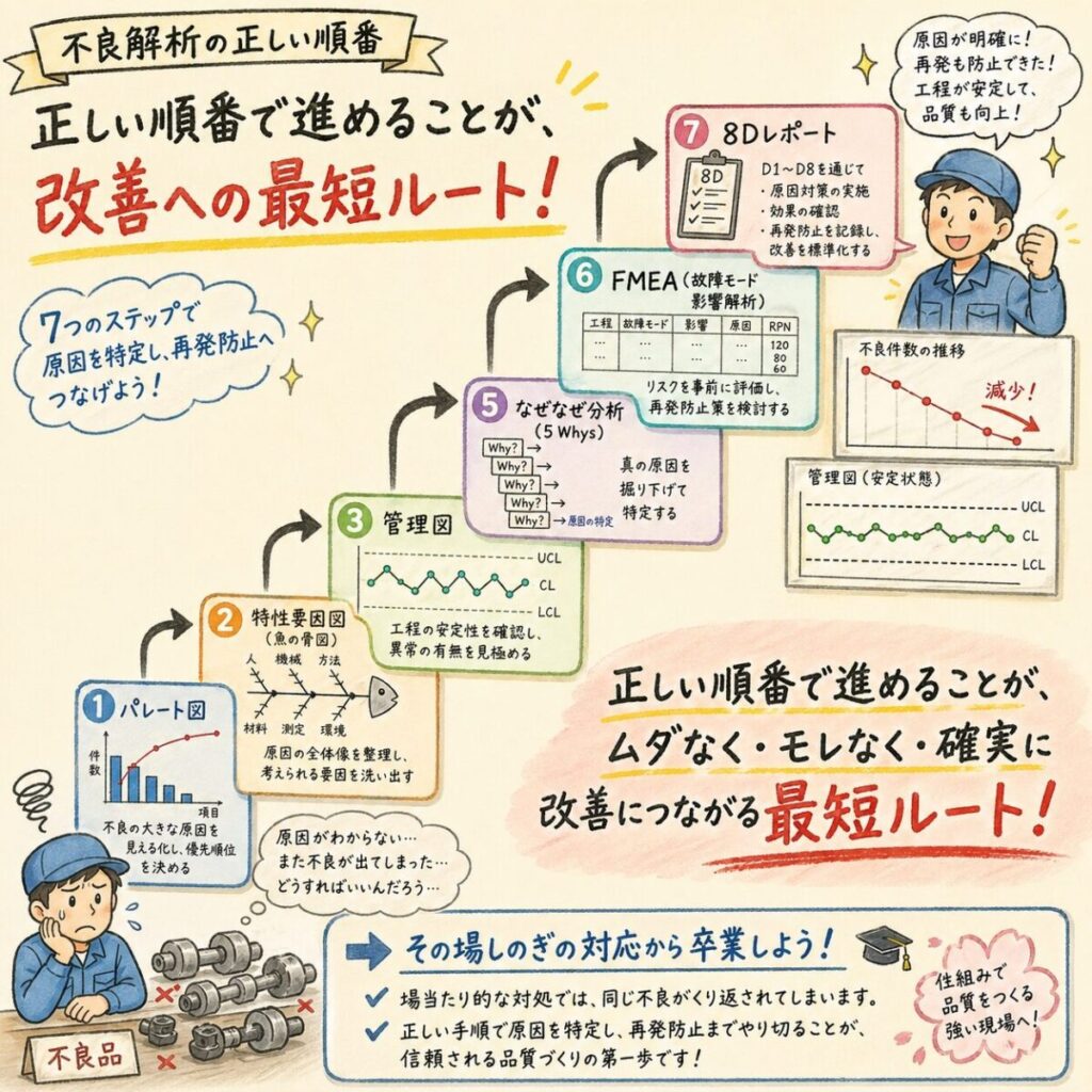 つまり、不良分析の本質は「どの道具を知っているか」ではありません。どの順番で使えば、再発防止まで最短でつながるかを理解しているかです。